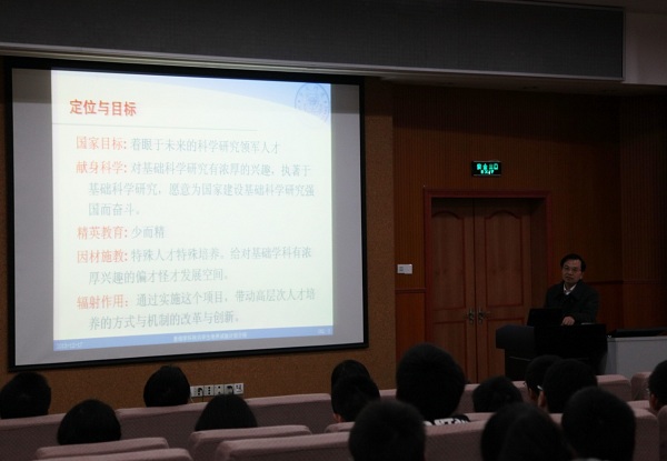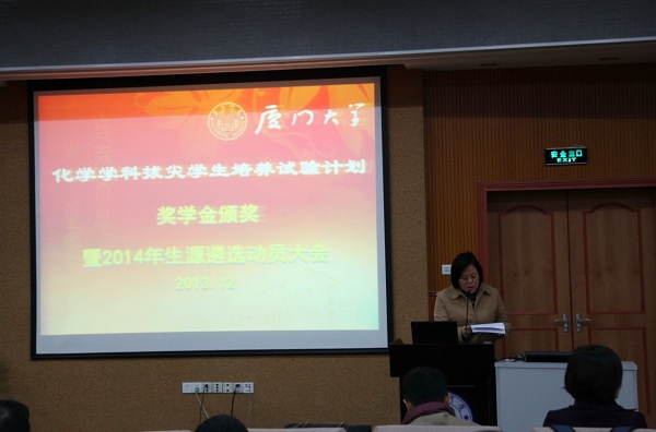 会上,李芬芬副书记宣读了《关于颁发厦门大学2013年度“化学学科拔尖学生培养试验计划”奖学金的决定》,获奖同学共48名,其中16人获得“化学拔尖计划”优秀奖学金。颁奖结束之后,夏海平教授为2013级本科生介绍了“化学拔尖计划”的具体情况,从班级设置、导师配置、特色培养、教学组织、培养方式的特点、考核与学籍管理、奖学金与专项资助计划等七个方面,详细阐述了“化学拔尖计划”的培养方式以及该计划在学术活动与国际交流方面的规定,并对2014年生源遴选情况进行了介绍。同学们对于这个计划都表现出了浓厚的兴趣,在夏海平教授介绍结束后,不少同学针对自己不清楚或感兴趣的部分提出了疑问,现场老师们也一一解答了同学们的疑惑。