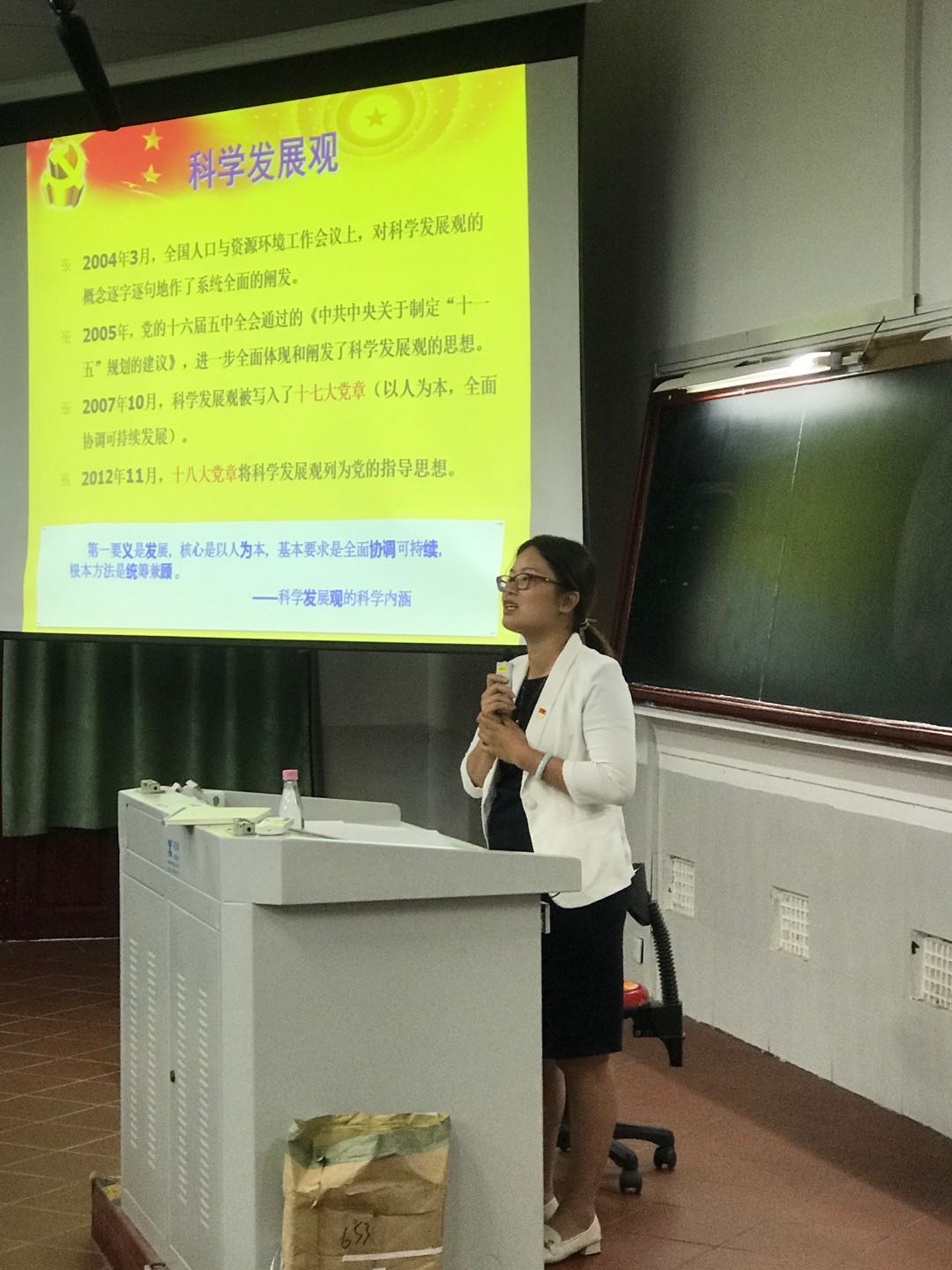随后,党委组织员林秀娟老师给同学们上主题为“中国共产党的指导思想”的第一节团课。考虑到不同年级、不同入党阶段的同学,林老师首先分享了入党的基本程序,介绍了入党原则以及申请入党的同学上团校的必要性。随后,林老师详细地介绍了马克思列宁主义、毛泽东思想、邓小平理论、“三个代表”重要思想、科学发展观以及习近平新时代中国特色社会主义思想。在授课过程中,林老师不时地将当下最新的党的理论知识和过去的相对比,深入浅出地解释了党章中陈述的内容以及党的方针政策,深刻地展示了中国特色社会主义进入了新时代这一时代感鲜明的论点。