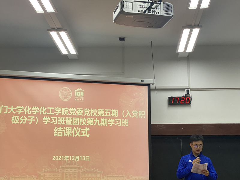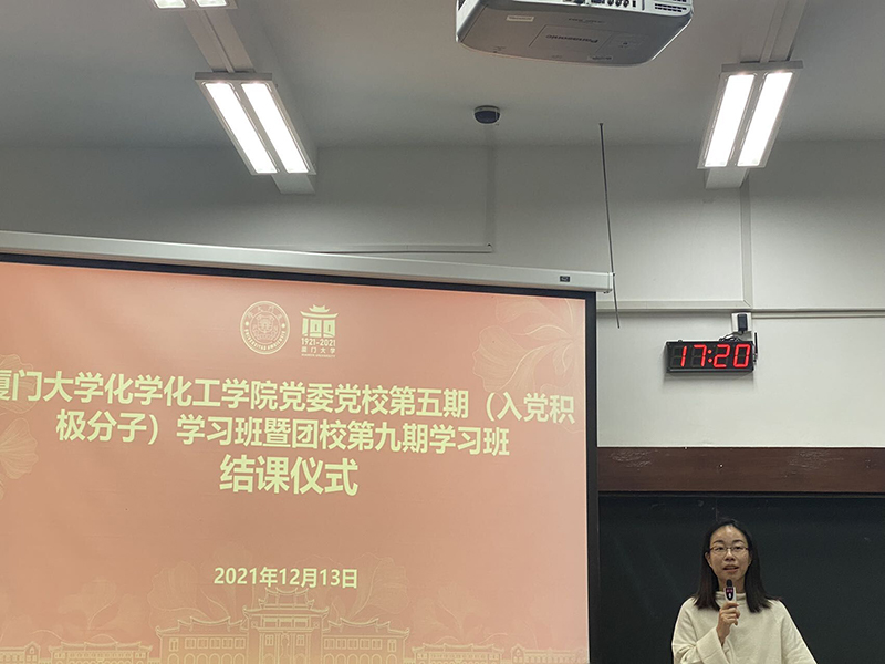 12月13日16时40分,厦门大学化学化工学院党委党校第五期(入党积极分子)学习班暨团校第九期学习班结业仪式在南强二105顺利举办。出席本次活动的嘉宾有学院团委书记刘恩恩老师、团委副书记杨家麒老师,本次活动由学院团总支综合事务部负责人张雨豪主持。