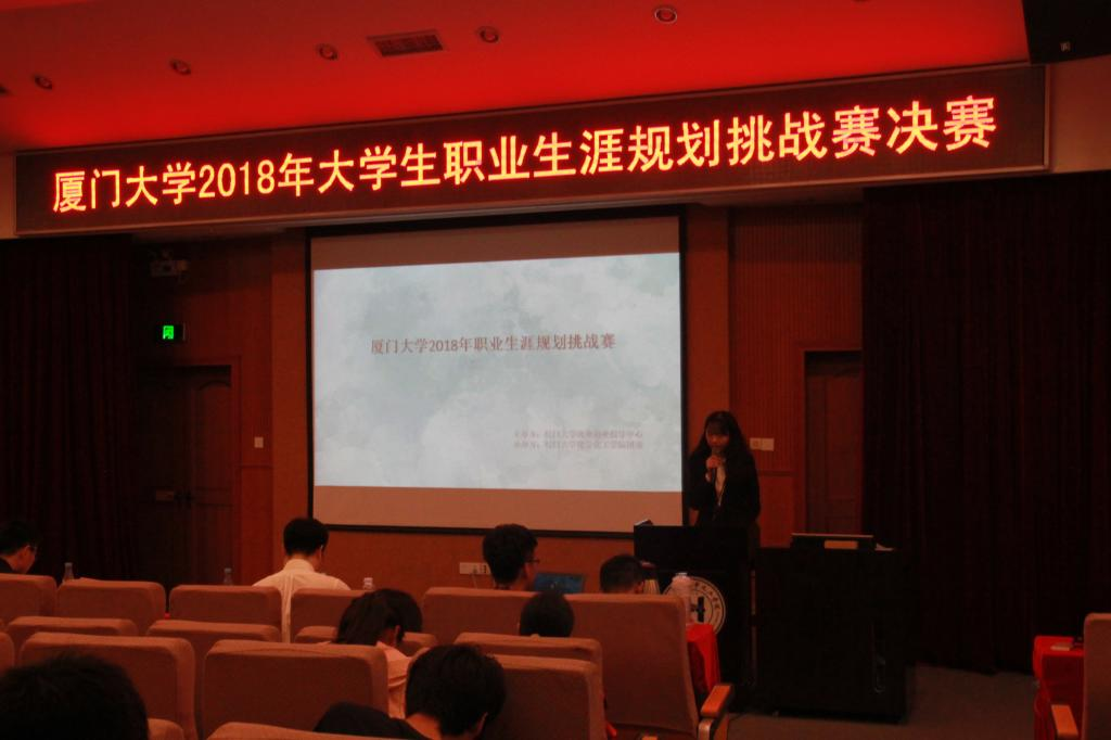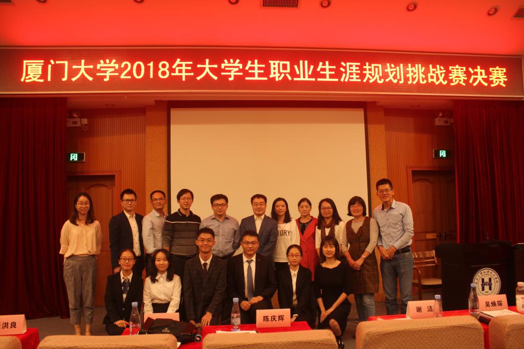 11月16日晚7时,由厦门大学就业创业指导中心主办,化学化工学院团委承办的厦门大学大学生职业生涯规划挑战赛决赛在我校化学报告厅隆重举行。出席本次大赛的评委有:建发股份有限公司人力资源副总经理陈庆辉先生、特步集团运营分析中心负责人谢洁女士、厦门万科城市合伙人于立言先生、厦门大学化学化工学院教授张宏良教授;此外还有学生就业创业指导中心老师任艳青老师,经济学院陈启妍老师、刘慧老师,化学化工学院团委书记刘恩恩老师、辅导员高世杰老师等人担任此次大赛的嘉宾。
