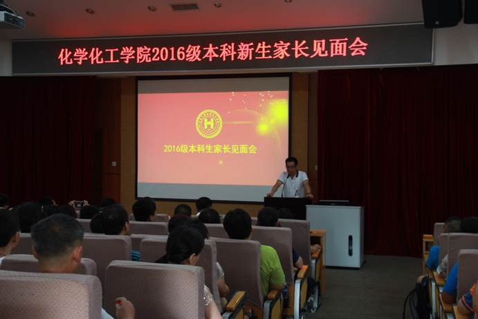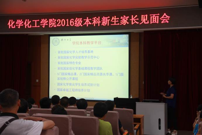 我院举行2016级新生家长见面会 8月25日早上9:00,厦门大学化学化工学院在化学报告厅举行了2016级新生家长见面会,旨在让新生家长了解我院学生培养体系和培养理念,对学院的各项发展有更深了解,与学院能够建立密切的联系,实现学院、家长充分交流,共同关注新生的成长。我院党委书记林辉,副书记李芬芬、刘俊杰,关工委老师潘宝柱,副院长朱亚先,团委书记刘恩恩,辅导员郭江淮以及2016级各班班主任等老师均出席会议,与家长面对面沟通。 院党委书记林辉对充满新鲜活力的2016级新生加入化院大家庭表示衷心的欢迎,之后由副院长朱亚先对我院信息进行较为详细的介绍。提问环节期间,朱亚先副院长、刘俊杰副书记等领导老师耐心回答了家长们的问题,包括他们关心的宿舍、课程以及素质教育等方面的问题,充分解答了家长的疑问,他们建议家长们要尽快适应家庭的新变化,尽快调整心态,开始新的生活,将关心转化为给孩子的鼓励,帮助孩子尽快适应大学生活。也希望家长能加强与学院的沟通,关注学院的发展,留意学院的网站信息;学院也将及时把学院的大事以及孩子每学年的各方面表现通过邮件和信件等方式给予反馈;希望保持密切的家校联系,共同教育培养学生,促其顺利成为有用之材。