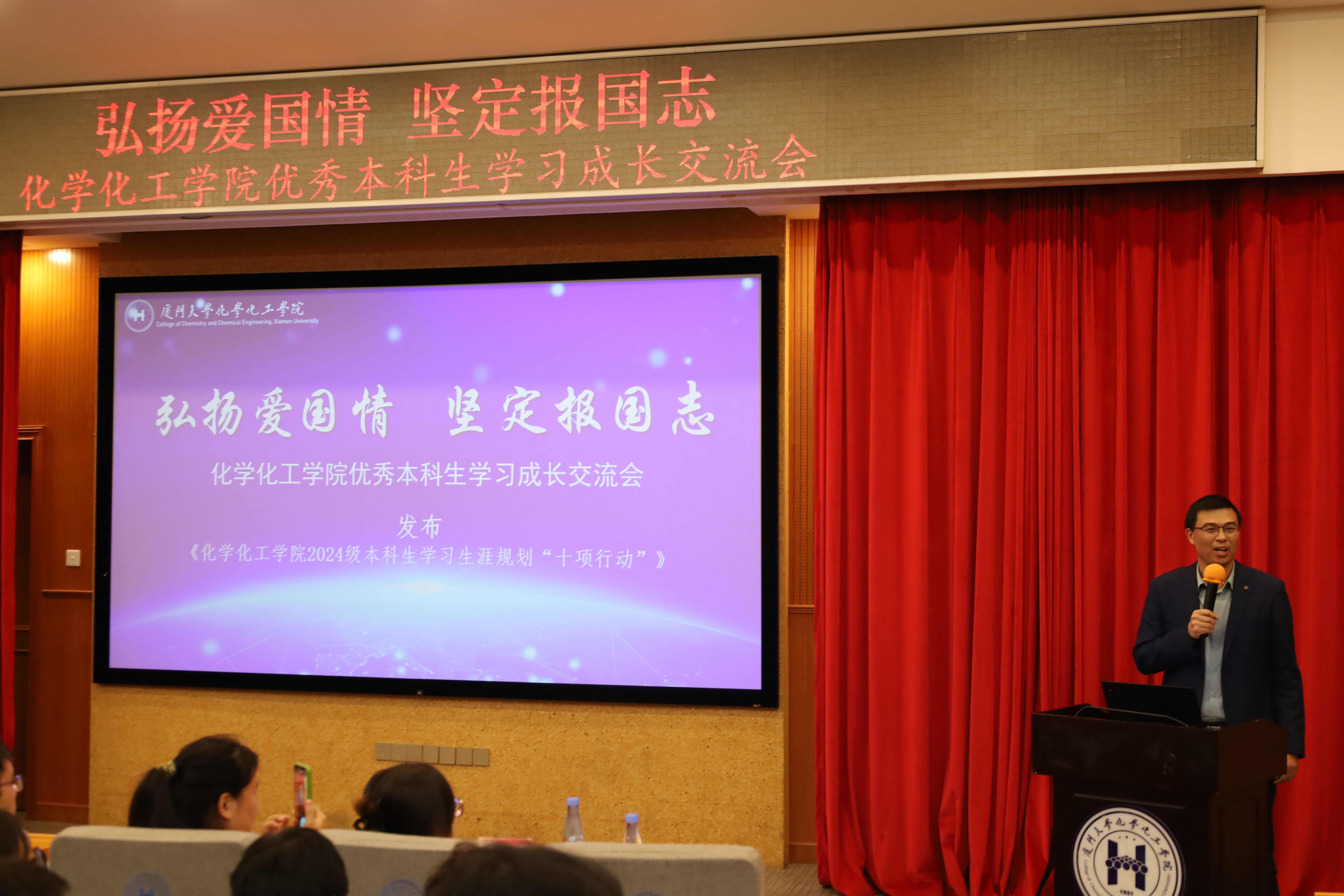在交流会上,杜超发布了《化学化工学院2024级本科生学习生涯规划“十项行动”》,包括:扣好大学生涯第一粒扣子、参加师者论坛、邂逅良师益友、加入“雏雁工程”、迈出科研第一步等十项行动。他鼓励同学们传承厦大化院“敢为先、重细节、合为贵”的优良传统,勇于探索、敢于创新,弘扬爱国情,坚定报国志,做一名光荣的厦大化院人。