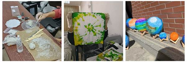 第一组同学制作彩绘泥塑,是在粘土里掺入少许棉花纤维,捣匀后捏制成各种形象的泥坯,再经阴干后上色。第二组同学借用“扎染”这一传统手工印染技术,用棉线在被印染的织物打绞成结进行部分印染,拆线后形成有小簇花样图案的彩图。第三组同学在预制的“月球”模型球体表面,直接用丰富的色彩绘制梦想的图片,内置LED灯后成为一盏夜间月球灯。