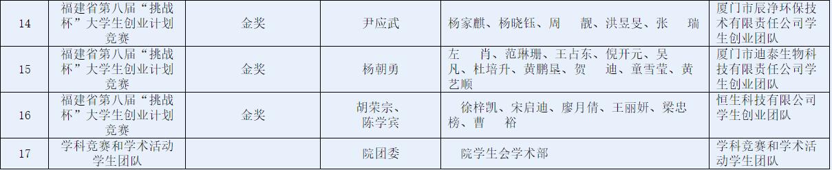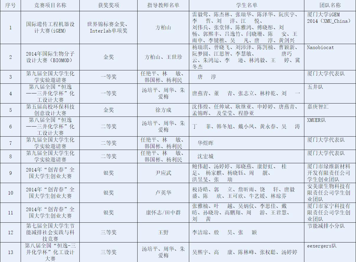 刘士博(13化学)、祝婉莹(13化学)、张亦伟(13化学)、陈婧琳(13化学)、冯敏(13化学)、张琪昀(13化学)、郑夏蓉(13化工)、林桂秀(13化工)、王泽树(12化学)、姜一鸣(12化学)、祖小龙(11化学)、卢帆(11化学)、郑碧珠(11化学)、张岩梅(11化工)