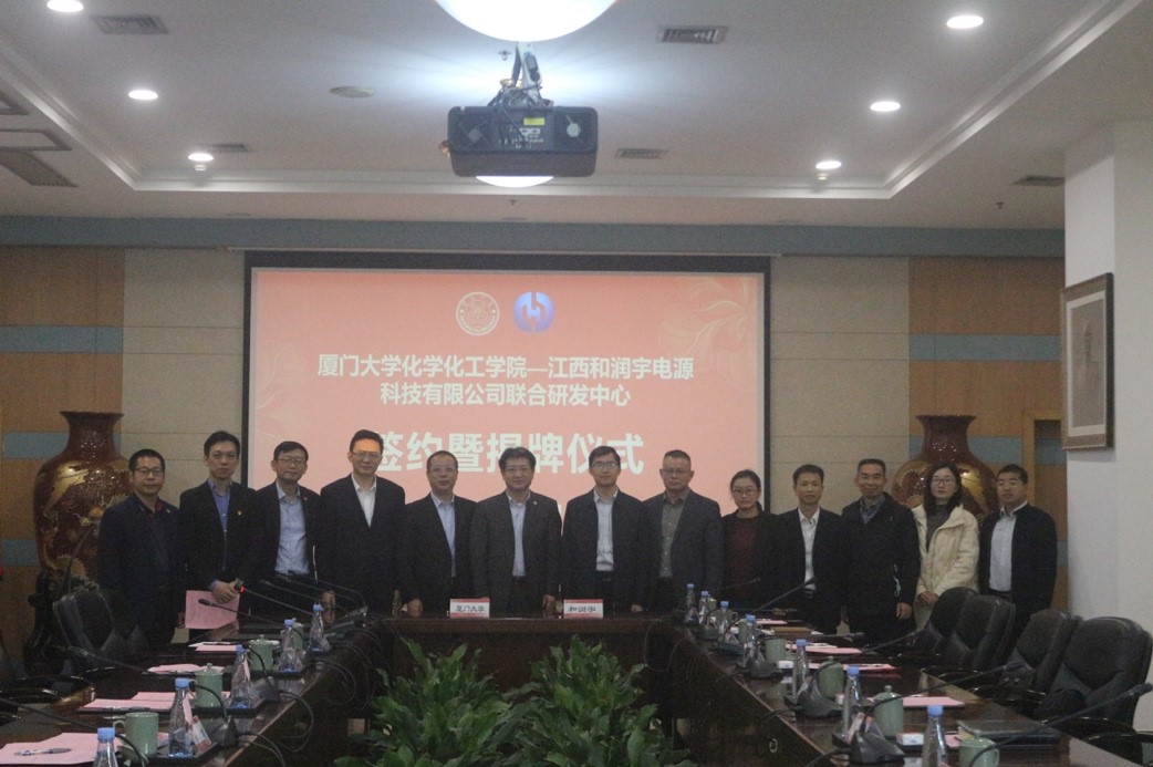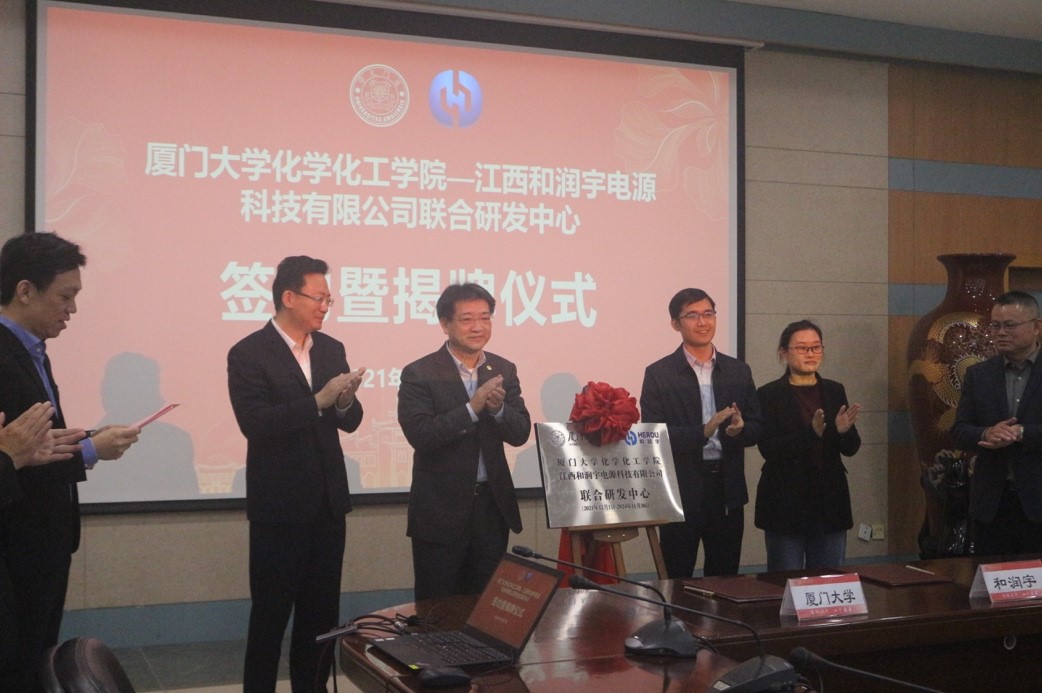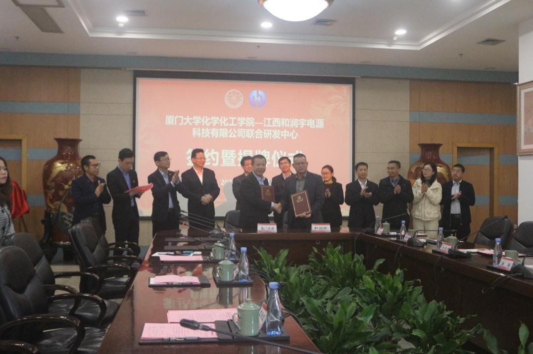 随后,厦门大学化学化工学院-江西和润宇电源科技有限公司联合研发中心正式签约。在与会人员共同见证下,詹东平教授和熊建文董事长分别代表双方签订共建研发中心合作协议。接着,刘永盛常委、朱丽珍副部长及江云宝副校长、孙理常委共同为联合研发中心揭牌。